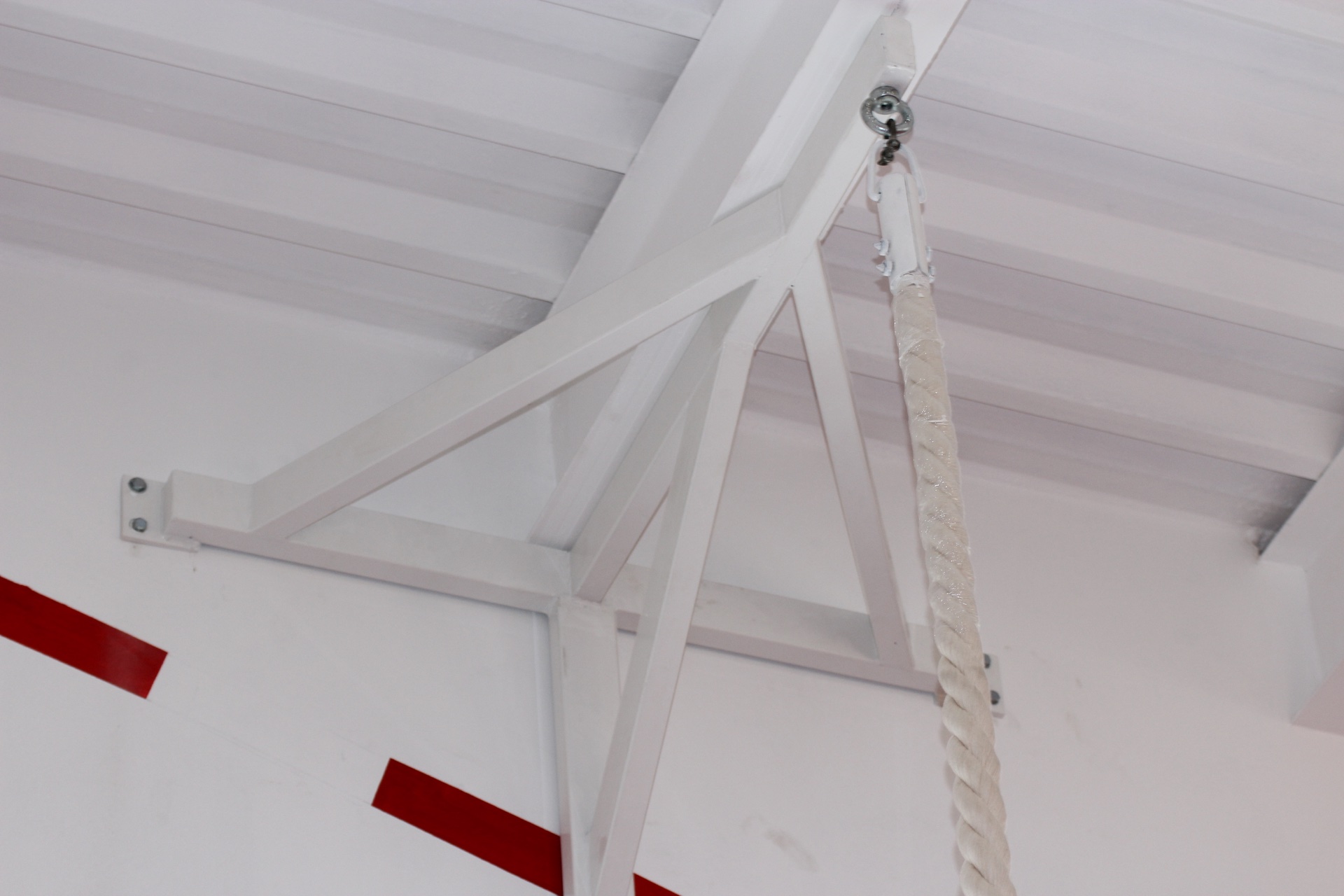 Система крепления рассчитана на 1 элемент: гимнастические кольца или канат. Данная система крепления представляет собой металлическую конструкцию, которая закреплена на стене с помощью анкеров, на высоте 5,75 м над уровнем пола, согласно требованиям федерации гимнастики.